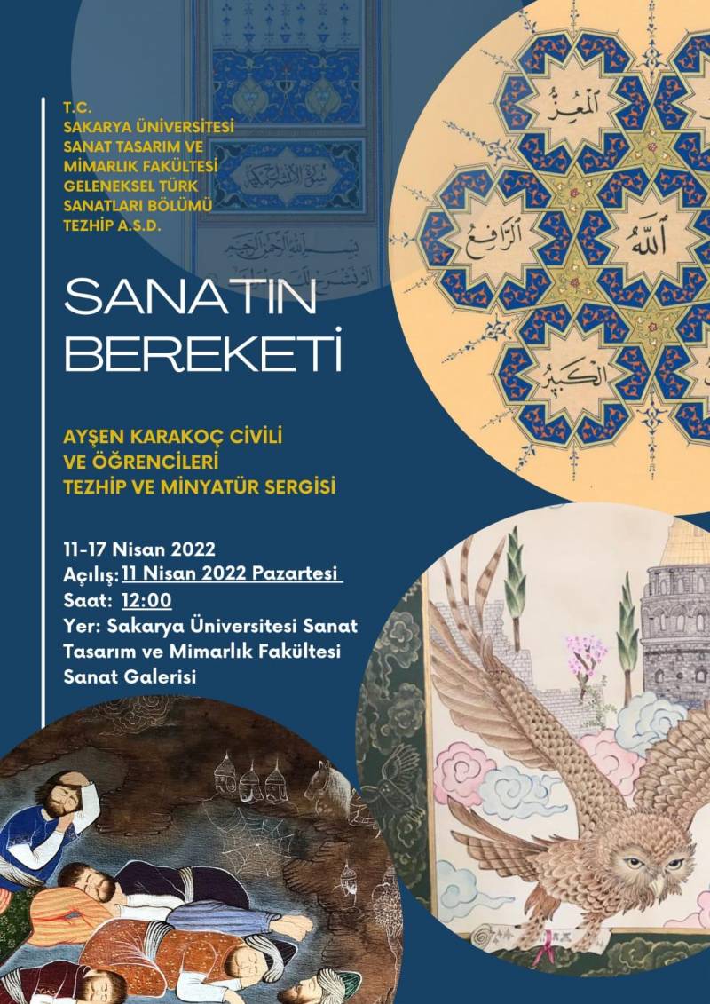 Toplumumuzda sanat eserlerimiz; merak, umut, umutsuzluk, hayranlık, üzüntü gibi paylaşılabilir duygusal etkiler ile gelişmiştir. Kültürel değerlerimizi yansıtması açısından sanat eserlerini toplumun aynası olarak görebiliriz. Binlerce yıllık Türk tarihinin ortaya çıkardığı, yeteneğinin ve düşünce gücünün en özel, en güzel yansımasıdır. “Sanatın Bereketi” Sergisi, Geleneksel Türk Sanatları Bölümü Tezhip Ana sanat Dalı Öğretim Görevlisi Ayşen Karakoç Civili nezaretinde 2021- 2022 Eğitim Öğretim Yılı Güz ve Bahar Dönemi Zorunlu “Tezhip, Yazı Süsleme ve Minyatür “dersini alan; Tezhip Ana sanat Dalı 2 .3 ve 4. sınıfta, eğitim - öğretim gören öğrenciler ile gerçekleştirilmiştir. İzleyeceğiniz sergide, Minyatür konuları Sakarya ilimizden görseller, Ashâb-ı Kehf (Yedi Uyurlar), Kuşlar ve Unutulmuş Mesleklerimiz yer almaktadır.