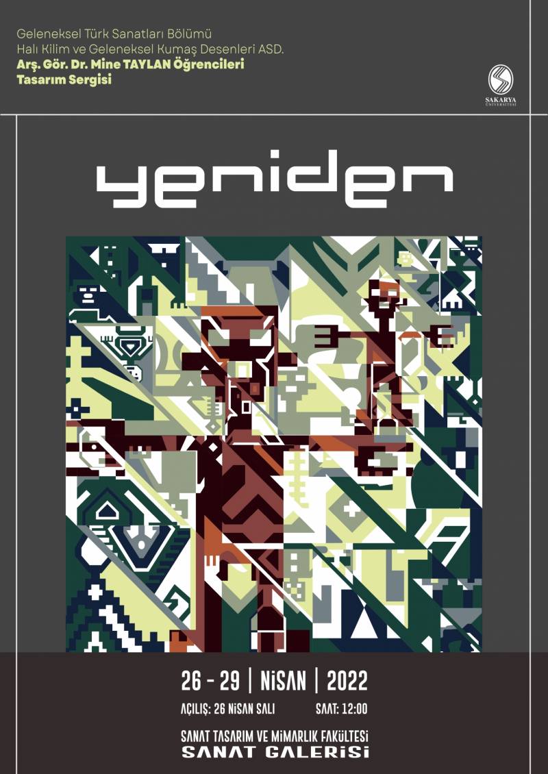 “Yeniden” isimli tasarım sergisi; Geleneksel Türk Sanatları Bölümü, Halı Kilim ve Geleneksel Kumaş Desenleri Anasanat Dalında eğitim gören II. ve III. sınıf öğrencileri tarafından guaş boya ile renklendirilmiş yüzey tasarımlarından oluşmaktadır. Eserler, Arş. Gör. Dr. Mine Taylan tarafından yürütülen Halı-Kilim Tasarımı I-II ve Dokumada Motif Sembol I-II dersleri kapsamında üretilmiş geleneğin ve yeniliğin birlikteliğini temsil eden özgün tasarımlardır. Geleneksel motif ve desenlerden esinlenerek oluşturulan birimler temel tasarım ilkeleri ışığında bir araya getirilmiş “yeni” olan hedeflenmiştir.