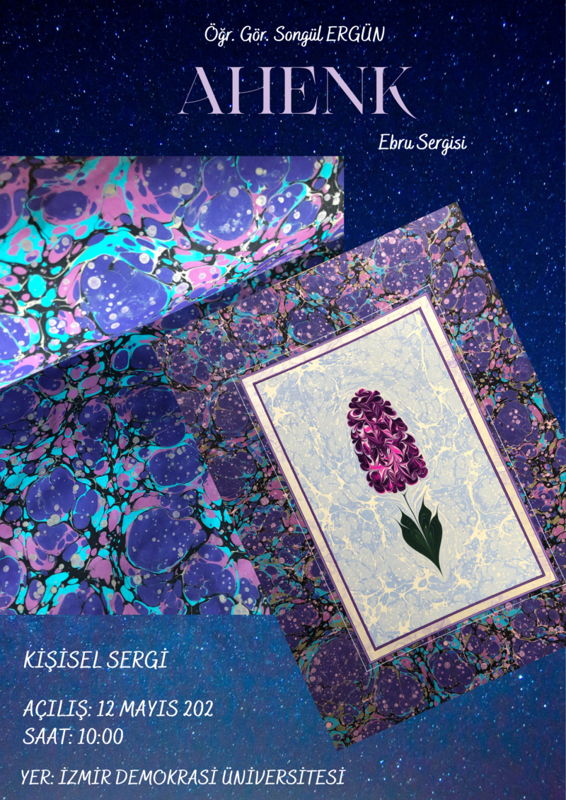 Sanat Tasarım ve Mimarlık Fakültesi, Geleneksel Türk Sanatları Bölümü, Çini Tasarımı Ve Onarımı Anasanat Dalı Öğr. Gör. Songül Ergün' ün "Ahenk" kişisel ebru sergisi İzmir Demokrasi Üniversitesi nde 12 Mayıs 2022 Perşembe günü saat 10:00 da sanatseverlerin beğenisine sunulacaktır.