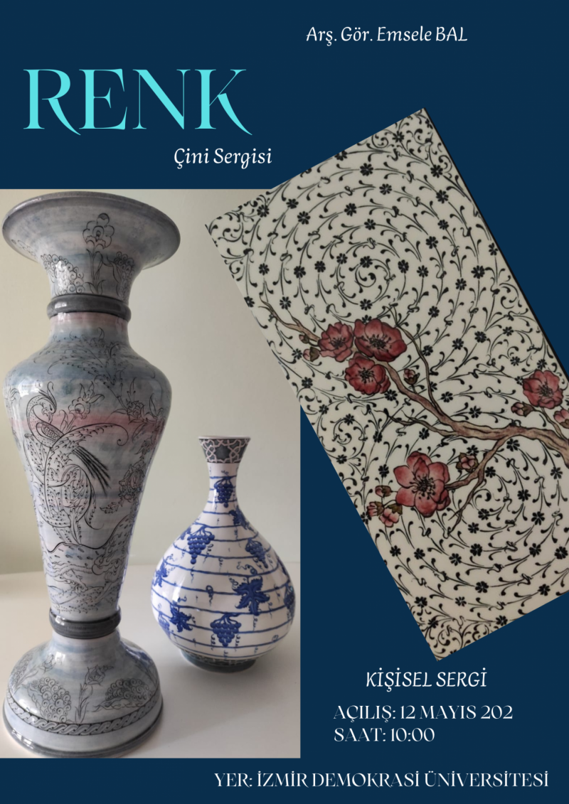 Sanat Tasarım ve Mimarlık Fakültesi, Geleneksel Türk Sanatları Bölümü, Çini Tasarımı Ve Onarımı Anasanat Dalı Arş. Gör. Emsele Bal' ın "Renk" isimli kişisel çini sergisi İzmir Demokrasi Üniversitesinde 12 Mayıs 2022 Perşembe günü saat 10:00 da sanatseverlerin beğenisine sunulacaktır.