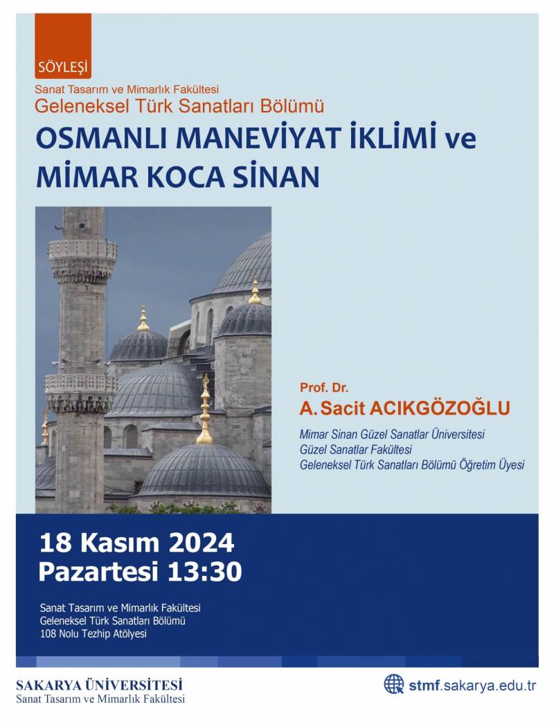 STMF Geleneksel Türk Sanatları Bölümü tarafından Mimar Sinan Güzel Sanatlar Üniversitesi Güzel Sanatlar Fakültesi Geleneksel Türk Sanatları Bölümü Öğretim Üyesi Prof. Dr. A.Sacit Açıkgözoğlu’nun konuk olduğu “Osmanlı Maneviyat İklimi ve Mimar Koca Sinan” konulu söyleşi düzenlenmektedir. Söyleşi, 18 Kasım 2024 Pazartesi saat 13:30’da Sanat Tasarım ve Mimarlık Fakültesi Geleneksel Türk Sanatları Bölümü 108 nolu Tezhip Atölyesi’nde düzlenecektir. Değerli katılımlarınızı bekliyoruz.